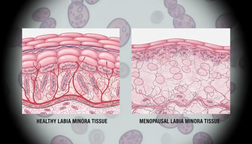 Labia minora menopause shrinking comes down to a combination of factors all happening at once. Estrogen drops. Collagen production slows down. The small fat pads under the skin reduce in size. Blood flow to the area decreases. Less blood means less oxygen and fewer nutrients reaching the tissue.