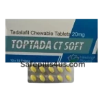 Store Toptada CT Soft 20 mg at room temperature in a dry place away from moisture and heat. Keep it in the original package until you are ready to use it. Do not use it past the expiration date and keep all medications out of reach of children and pets. Each chewable tablet contains tadalafil 20 mg as the active ingredient. Inactive ingredients can vary by batch or manufacturer. Packaging is commonly supplied in blister strips or cartons with an expiration date and lot number for quality tracking. The look of the package may differ, but the labeled strength and active ingredient stay the same.